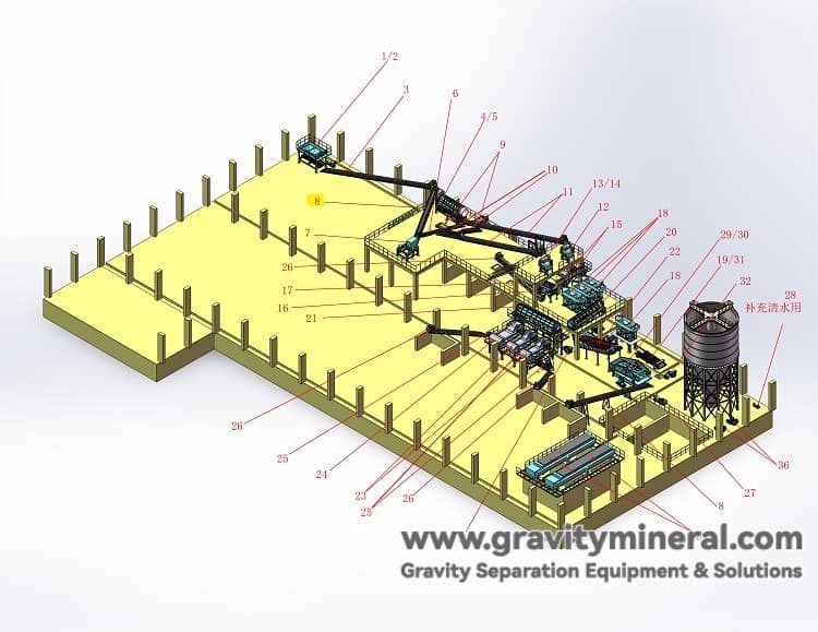 | Gravity separation | Jigger+Shaker | Fine sorting, recovery of precious metals | 200-2000t/d |